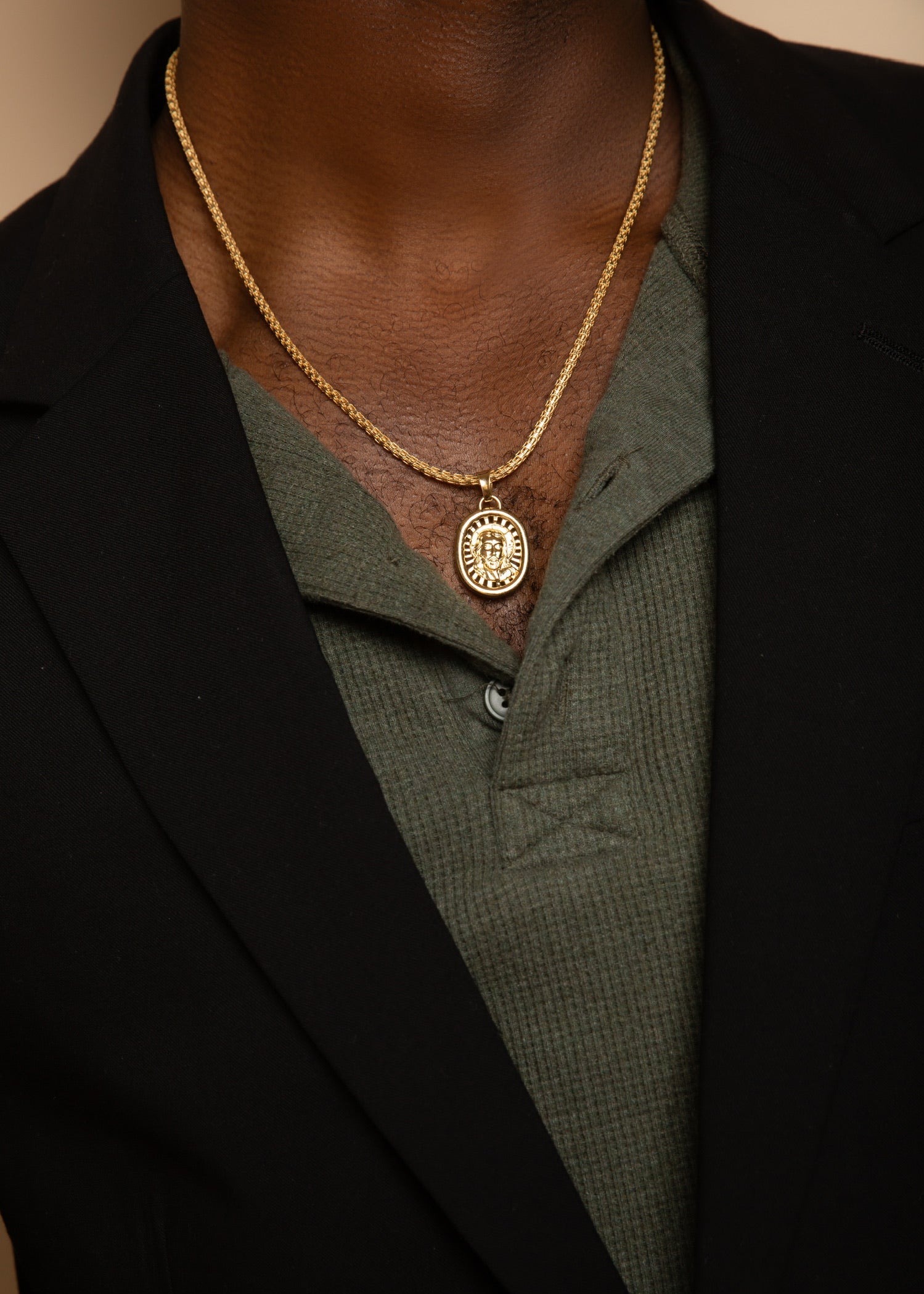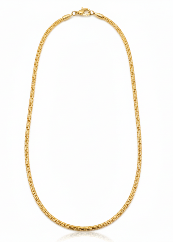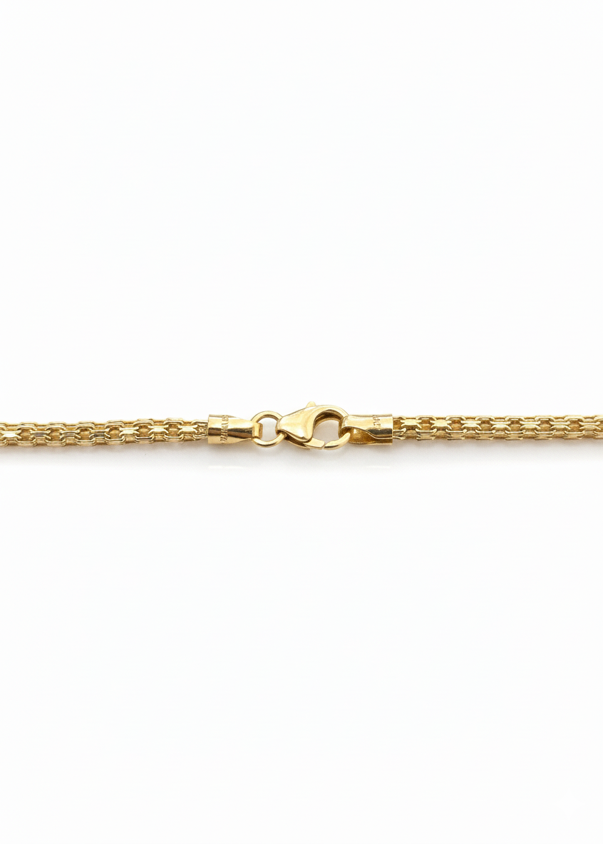 A refined Round Bismarck chain crafted in solid 18K gold, featuring a tightly woven, rounded link structure that delivers both durability and elegance. Its classic yet bold design reflects light beautifully, making it a versatile piece for everyday wear or layering with pendants.